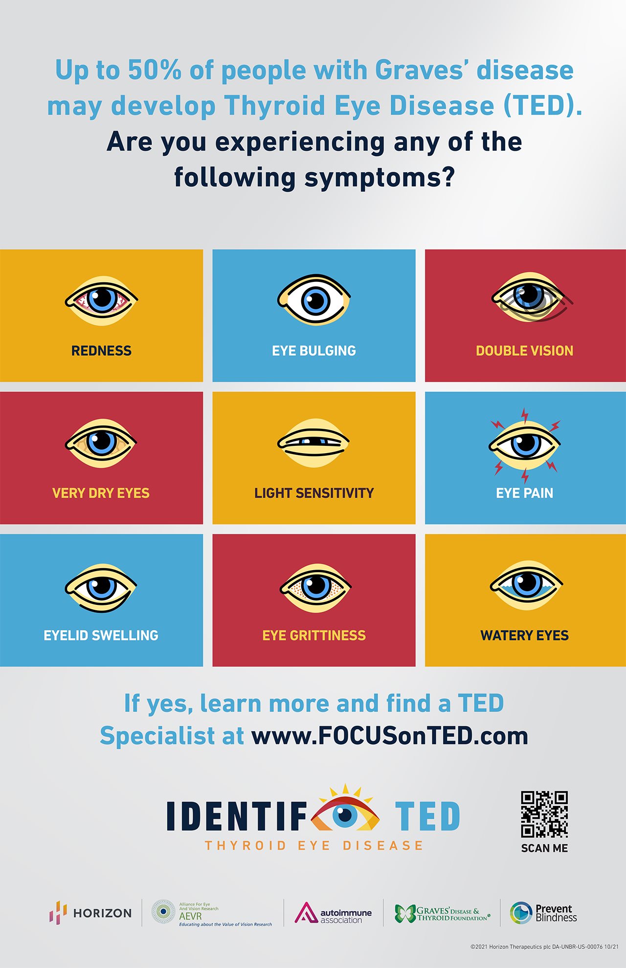 - Up to 50% of people living with Graves’ disease may develop TED