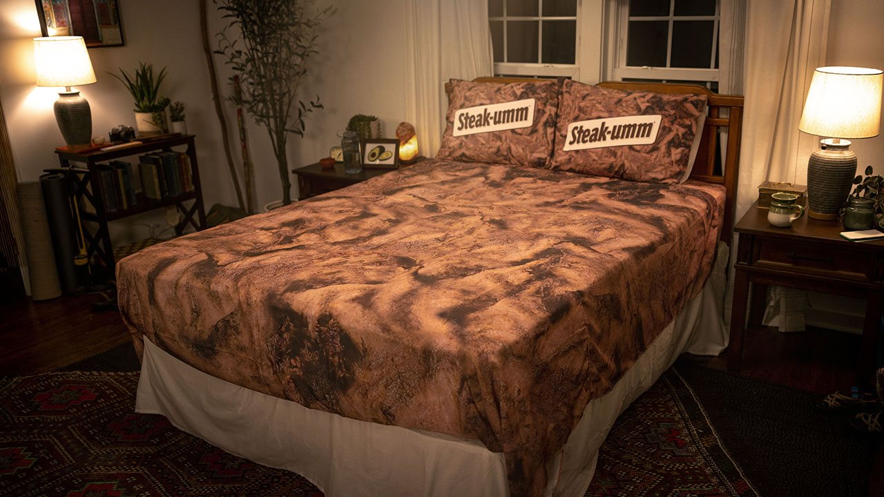 Steak-umm, the iconic frozen meat brand known for their viral social media presence, just unveiled their wildest innovation yet. If you’ve been a follower of the brand, then you know that they (and their fans) refer to the frozen sliced steaks as “beef sheets.” But now, they’ve taken an unexpected twist on their internet moniker, making Beef Sheets even vegans can enjoy. Yes, they made actual queen-sized bedsheets that look just like a giant sheet of cooked Steak-umm.